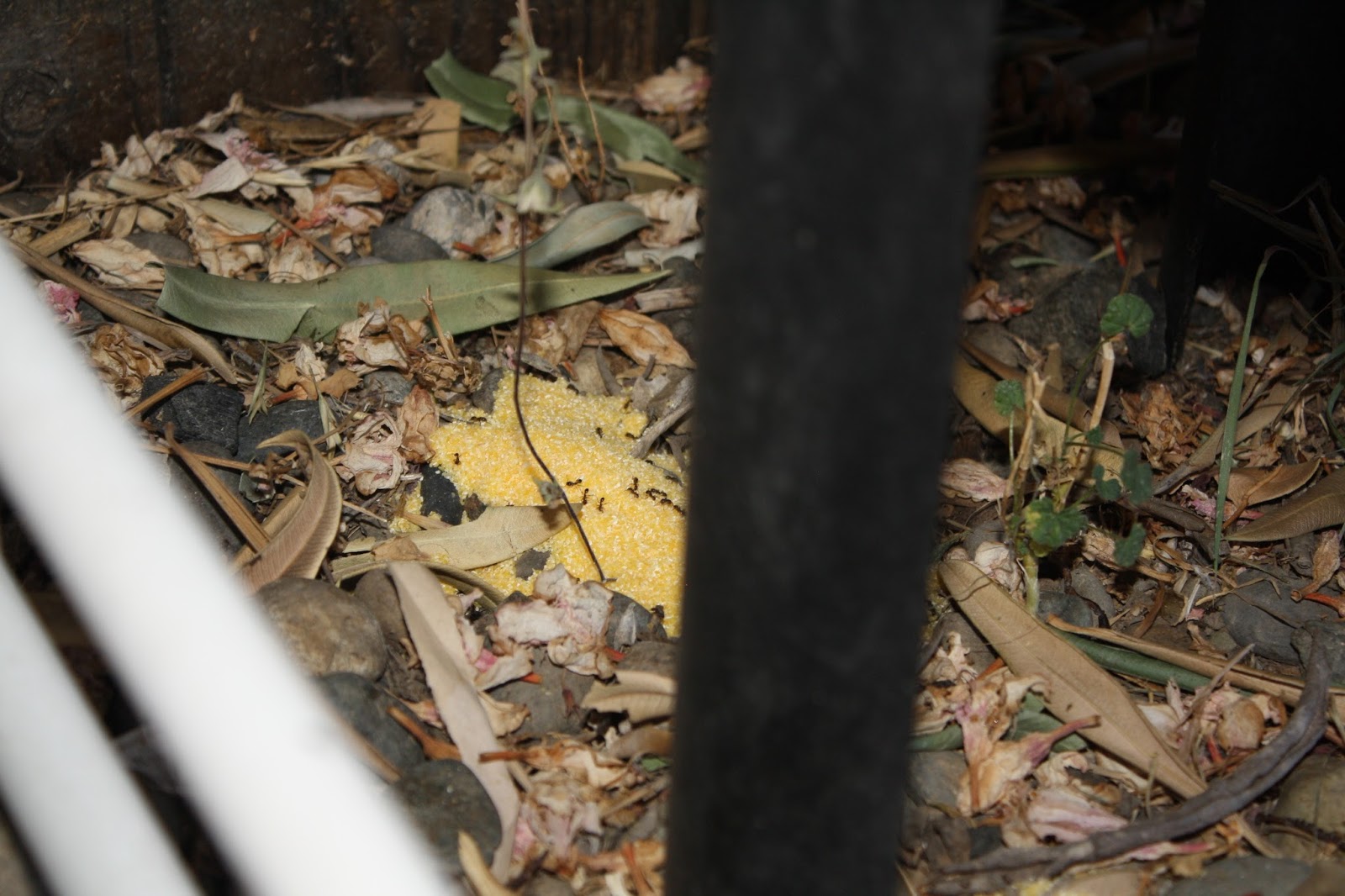 I got out the hose, sprayed the bin down, and set it back in place. I also brought out some corn meal and poured a healthy amount near each leg of the bins, hoping that perhaps the ants would go to the cornmeal and not pay attention to the buffet of decomposing food above them in the bin.